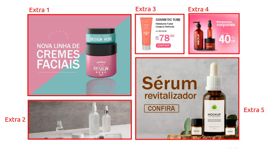 Extra 1 e Extra 5: 690x550 Extra 2: 690x260 Extra 3 e Extra 4: 330x260