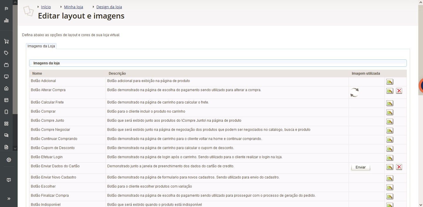 O botão com um lápis serve para editar ou inserir uma imagem para aquele determinado local. O botão com um x permite remover a imagem padrão ou previamente cadastrada.