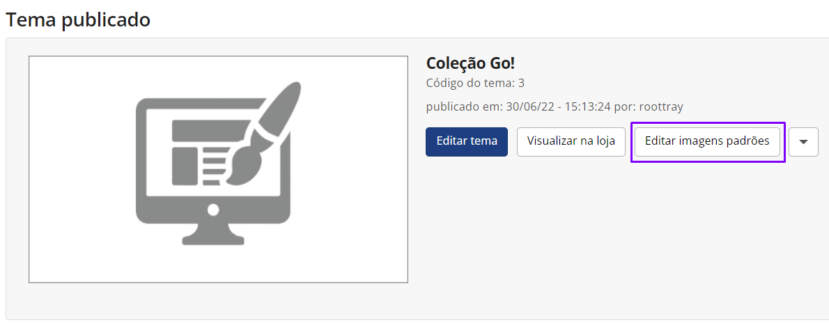 Os temas dessa coleção personalizam quase que totalmente os elementos visuais da sua loja. Porém alguns deles são vinculados através da plataforma. Para personalizar tais imagens é muito simples, basta acessar Minha Loja > Design da Loja > Editar Imagens Padrões. Esse opção está disponível somente para o tema publicado. É possível inserir / alterar botões do checkout, favicon, entre outros.