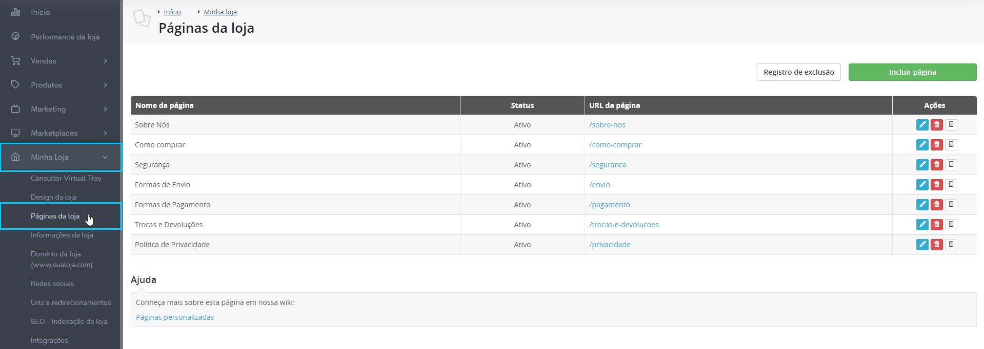 Toda loja conta com páginas relacionadas a operação e a empresa. São páginas com conteúdo fixo, diferente da página principal, página de produtos, categorias, carrinho e painel do cliente. Algumas páginas extras comuns em lojas são: Sobre a Empresa, Segurança, Como Comprar, Pagamento e Envio. Essas páginas podem ser configuradas acessando Minha Loja > Páginas da Loja.