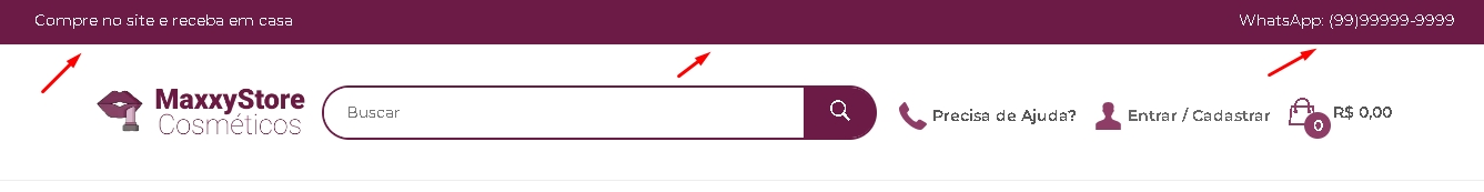 Cor de fundo: Cor do fundo da barra superior. Ela fica acima do cabeçalho da loja contendo informações de ajuda e contato.
