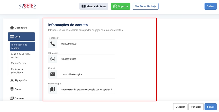 Cabeçalho: Inclui links úteis para essa documentação, vídeos explicativos, suporte da Sete Digital e sugestões, além do link de pré-visualização e o botão para publicar o tema. Esse último item só aparece se o tema não estiver publicado.